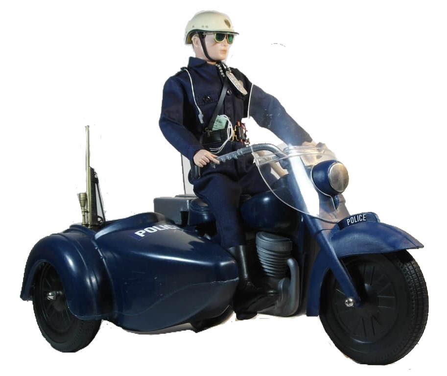 Accessories: Motorcycle w/ Sidecar, Trooper Figure, Police Shirt w/ Badge, Pants, Boots, Police Helmet, Belt w/ Pistol, Traffic Tickets, Sunglasses, Handcuffs, Whistle, Pencil, Billy Club, Flashlight, Rifle,