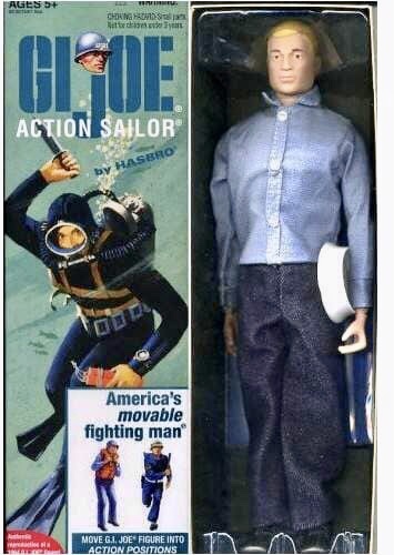 Notes: Hasbro released the Talking Action Sailor in 1967. He talked by pulling his dog tags outwards, then releasing. He said different phrases, depending on how the tags were pulled. The Talking Sailor was released with the different colored hair types and eye colors as well.