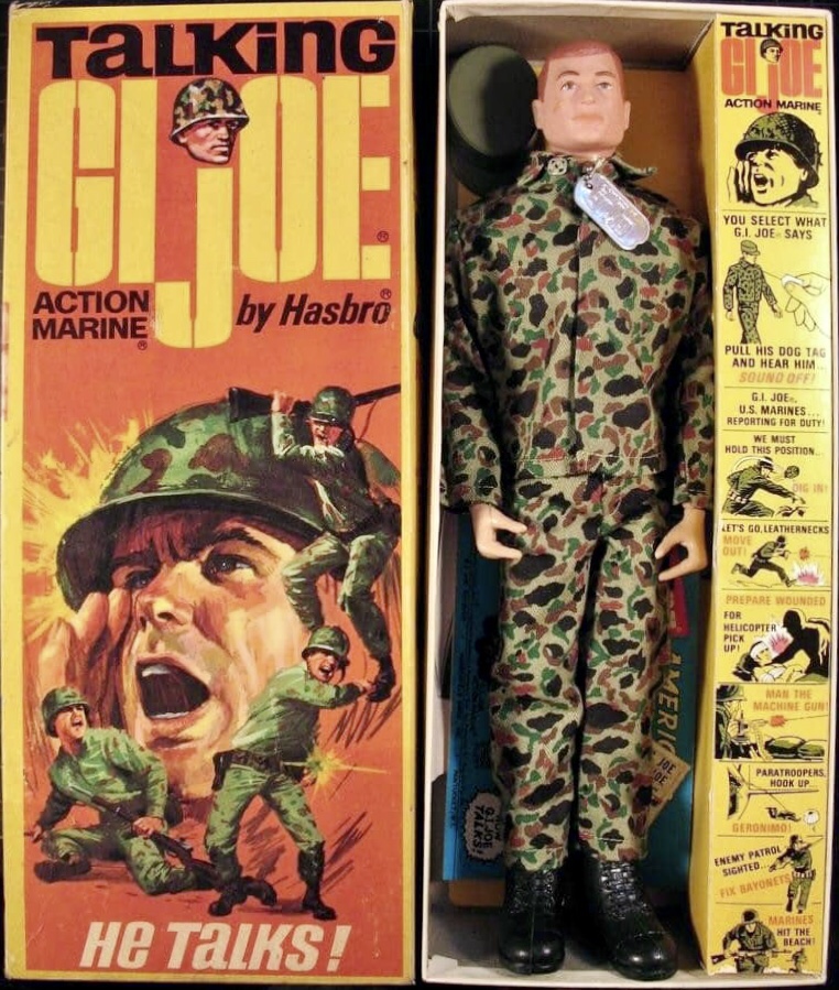 Notes: Hasbro released the Talking Action Marine in 1967. He talked by pulling his dog tags outwards, then releasing. He said different phrases, depending on how the tags were pulled. The Talking Marine was released with the different colored hair types and eye colors as well.