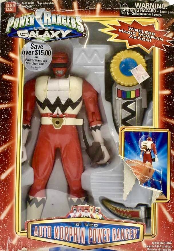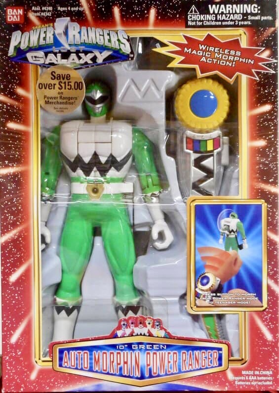The Auto Morphin Power Rangers included only three of the Ranger characters, Blue, Green and Red, and were produced in a 10″ format. Each figure came with a morpher accessory.