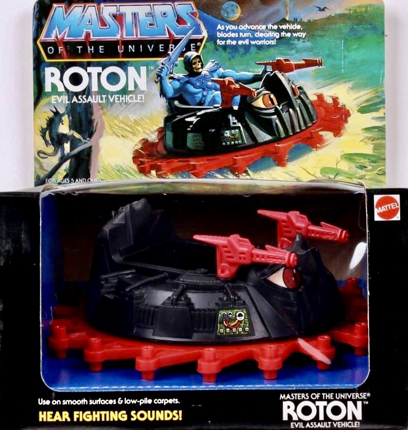 Roton was a pretty interesting looking vehicle, especially with its two big red eyes on the front of it. It was the first vehicle made for Skeletor’s Evil Warriors, and it was about time! The Roton vehicle had a red saw blade all around it, which spins when the vehicle is pushed forward or backwards. I just love the insane design on this thing and the sinister looking color scheme.