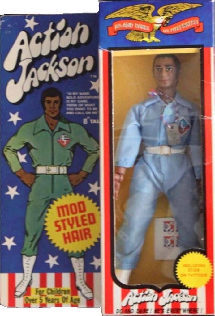 Notes: The African-American version of the Action Jackson figure was one of three head molds that were created for the line. This figure was also available in a bearded version but is very rare. Like the others in this line, there were many variants to this figure and this version has the African-American Action Jackson in a light blue jumpsuit.