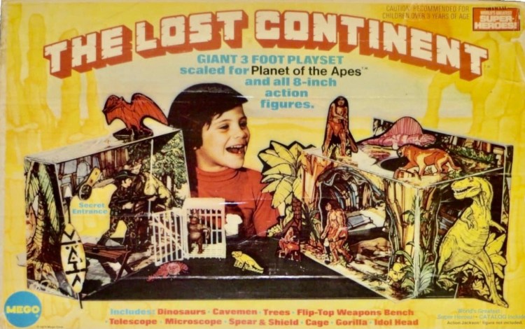 Notes: The Lost Continent Playset was among the final items released for the Action Jackson line in 1974. The Lost Continent box actually had two different versions, with one being a regular Action Jackson accessory box and the other saying that it could be used with the Planet of the Apes figures. The box was re-branded towards the end to help sales a bit, since the Planet of the Apes figures were selling like crazy at the time. The playset itself is basically the same as the Bat Cave playset and the Planet of the Apes Village Playset, which also both came out in 1974, with many of the same pieces. Both Lost Continent versions are extremely tough to find in their complete boxed versions, and can command top dollar on the secondary market.