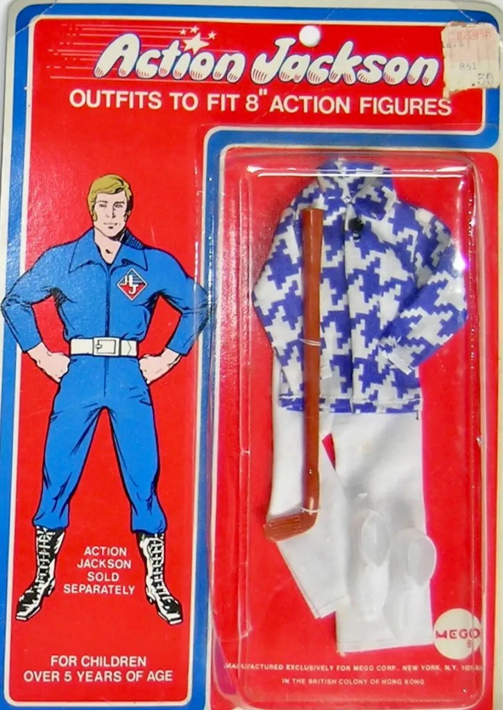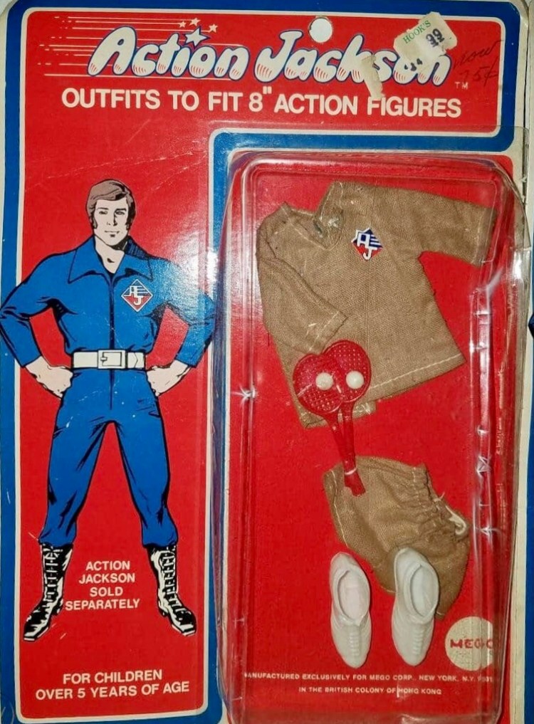 There were several outfit sets released for the Action Jackson line with all the initial releases being on the ornately illustrated card featured on the row beneath. The photo to the right shows the later releases, which did not feature the unique action illustrations. Instead they had a more plain look with a generic Action Jackson illustration on each one.