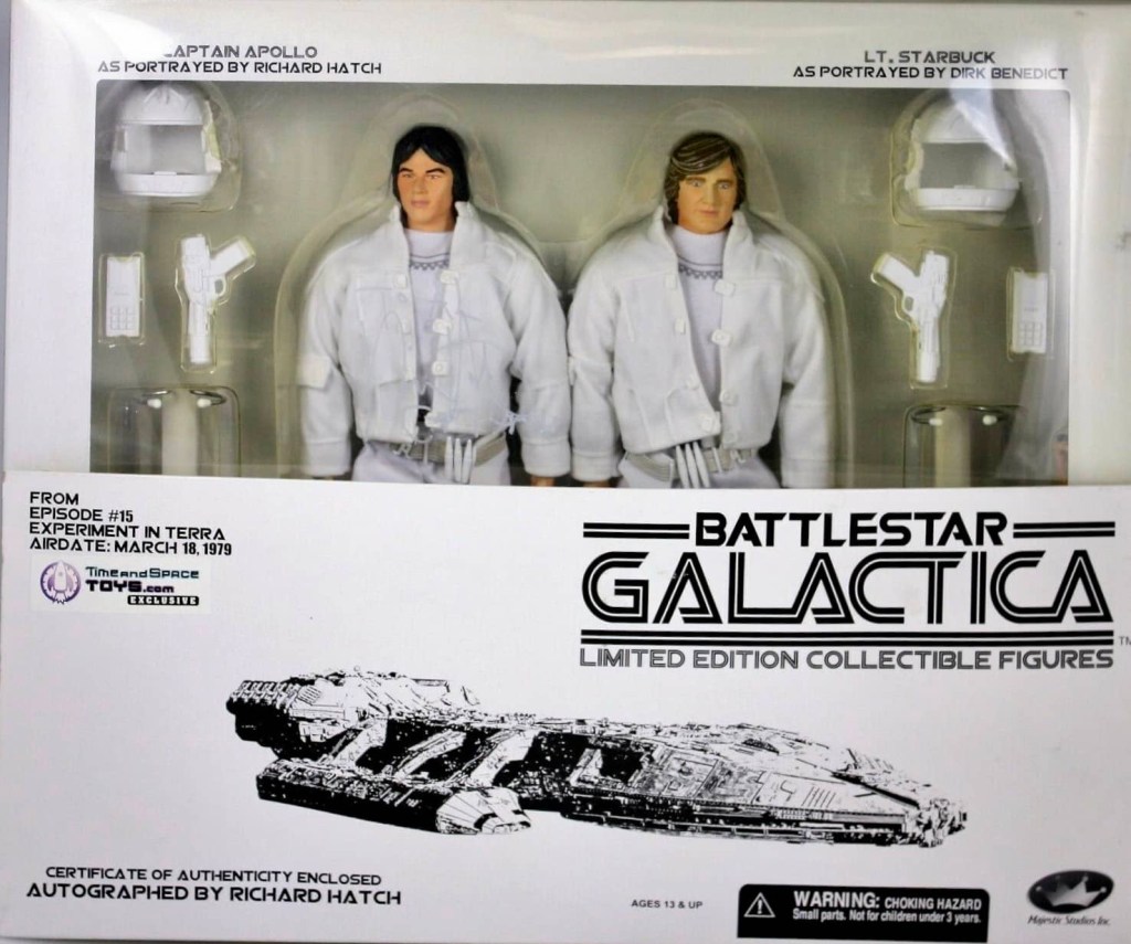 Notes: This two-pack included Apollo and Starbuck as they appeared in the classic Battlestar Galactica episode “Experiment in Terra”. In the episode, the characters’ uniforms and accessories turned white while in the presence of the white aura. Each set was also individually numbered and came with a Certificate of Authenticity that was personally autographed by Apollo actor Richard Hatch. The set was a Space Toys exclusive in 2006 and limited to 500 pieces.
