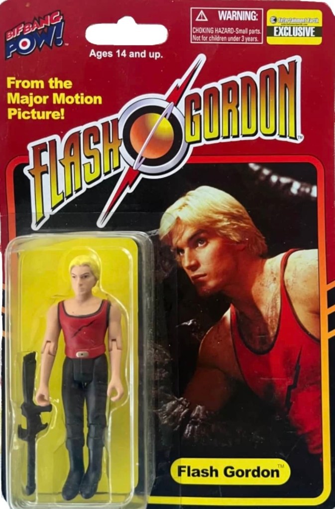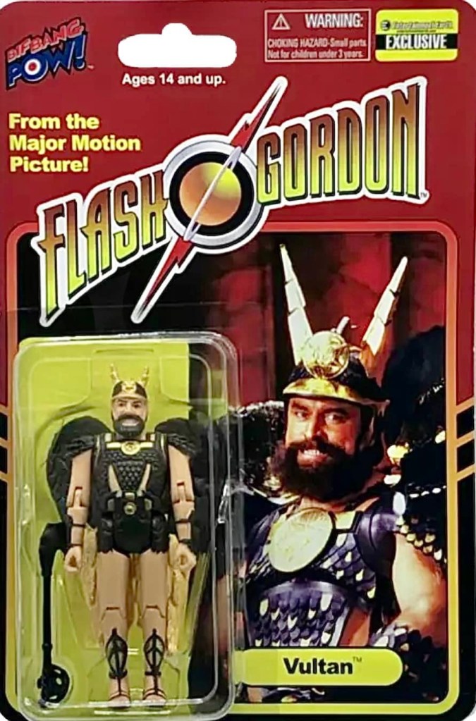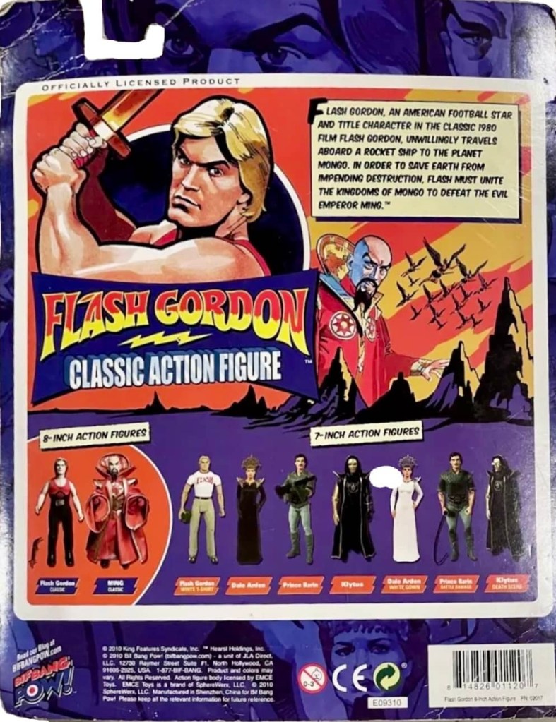 Bif Bang Pow! released a few different Flash Gordon Movie action figure line from 2007 to 2015, including a few different figure formats and variations. There were a total of four action figures in the first wave of 7 inch figures in 2007, with two versions of Ming The Merciless and two versions of Flash Gordon. Series 2 included four more figures, with a 3rd version of Flash Gordon, Dale Arden, Prince Barin, and General Klytus. Exclusives of Klytus, Barin and Dale Arden were released in 2010 as SDCC exclusives. Bif Bang Pow! released two retro-styled action figures in 2010, with Flash Gordon and Ming the Merciless in an 8″ format with cloth costumes. Finally, they released five different figures in a 3.75″ format (Flash, Ming, Prince Barin, Vultan, Princess Aura) in 2015 through Entertainment Earth, along with an exclusive SDCC two-pack with Flash and Ming.