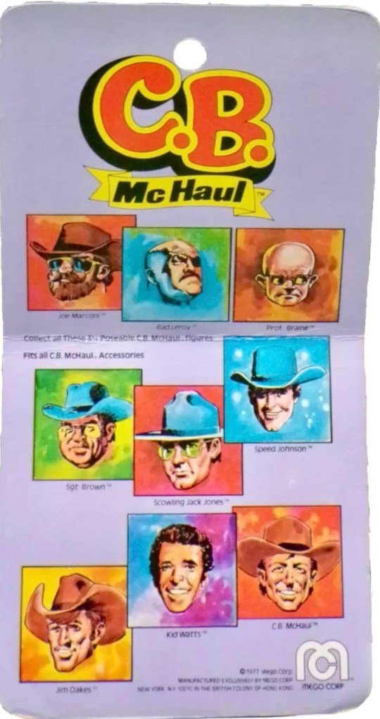 Mego released their C.B McHaul toy line in 1977, which was the result of the CB and truck driving fad that hit America during the mid to late 1070’s. The line was playfully named after singer, C.W McCall, who struck gold with his mega hit, Convoy (from the Conoy movie soundtrack). The C.B McHaul line included nine figures, a few vehicles and a truck stop playset. The figures stood just over 3″ tall, and used the same molds as Mego’s Comic Action Heroes. Each figure came with a base to allow it to stand up.