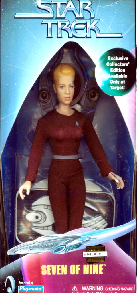 Seven of Nine (Jeri Ryan) was, in my humble opinion, the best thing about Voyager. She is a former Borg drone who joins the crew of the USS Voyager. Playmates gave us two different versions of Seven of Nine with the standard Silver Outfit version in 1998 and then a Brown Outfit version in 1999 which was an exclusive to Target retail stores.