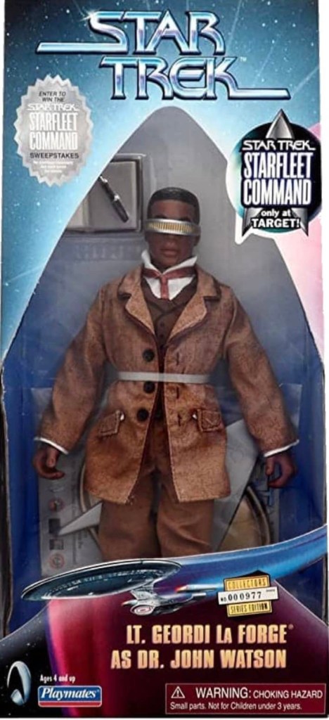 And now for the big NUMBER ONE Star Trek 9″ Figure By Playmates….Lt. Commander Data & Lt. Geordi LaForge as Sherlock Holmes and John Watson from the classic Next Generation episode, Elementary Dear Data. These amazing figures were only available at Target retail stores in 1999. The costumes on these guys are incredibly spot on with their classic Sherlock Holmes threads. The Next Generation crew had lots of opportunities to appear in different costumes and alter-ego’s, but big kudos to Playmates for making these two fan favorites into action figure reality.