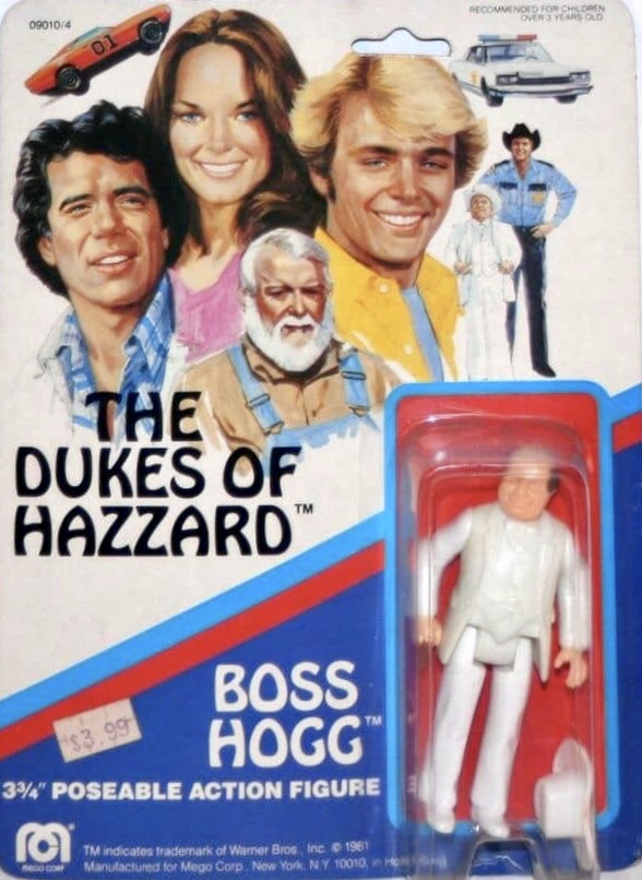 Notes: Boss Hogg was portrayed by Sorrell Booke in the television show from 1979 – 1985, and acted as the main bad guy on the series, basically controlling the police department. Boss Hogg was the only Series 1 figure to feature an accessory, which was his white cowboy hat. Boss Hogg was also available with his Caddy vehicle accessory.