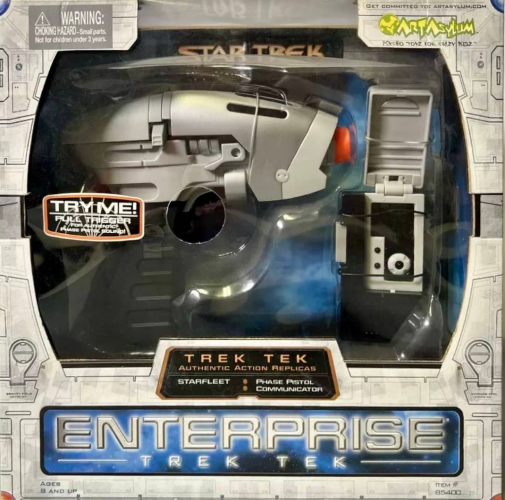 Notes: Art Asylum released this fun two-pack for their Star Trek: Enterprise line containing a role play Phase-Pistol and a Communicator. The pistol came with lights and sounds when you pulled the trigger. The communicator had an old school flip open cover with realistic lights and sounds. This was the lone accessory for the Enterprise line by Art Asylum.