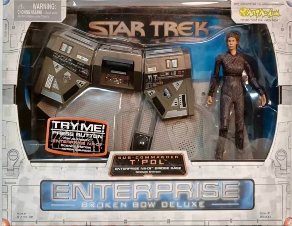 Art Asylum released three deluxe figures for the “third and final wave of their re-released Mego Star Trek line in “Broken Bow” wave in 2001. Like the standard “Broken Bow” figures, these figures were all themed to the two-part series premier titled “Broken Bow”. These figures were titled as Deluxe, due to being released with a section of the Enterprise Bridge. Each section was appropriate to the character.