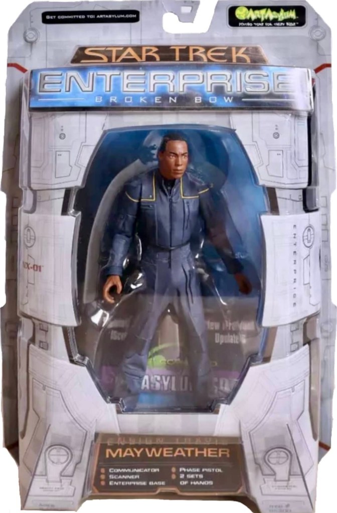 Notes: Malcom Reed was the Tactical and Armory Officer aboard the Enterprise, and was portrayed by Dominic Keating on the show. The figure is based on his appearance in the two-part series premiere “Broken Bow”. Ensign Mayweather comes with two phase-pistols, communicator, scanner, utility case, an additional set of hands and an Enterprise display base.