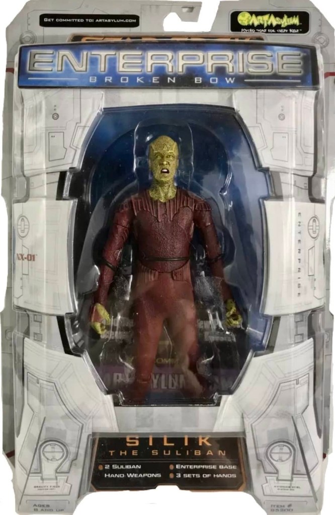 Notes: Silik was an official in the Suliban Cabal during the Temporal Cold War. He was portrayed by John Fleck on the show. The figure is based on his appearance in the two-part series premiere “Broken Bow”. It should be noted that Silik does eventually meet his end in the episode “Storm Front”. Silik comes with two Suliban phasers, an additional set of hands and an Enterprise display base.