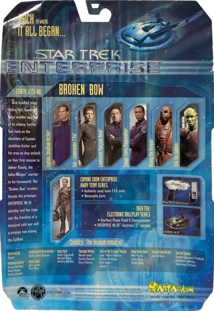 Art Asylum released six figures for the first wave of their Star Trek: Enterprise line in 2001. All figures from Series 1 were themed to “Broken Bow”, which was the two-part premier of Star Trek: Enterprise. The wave included Captain Jonathan Archer, Ensign Travis Mayweather, Klaang the Klingon, Lieutenant Malcolm Reed, Silik the Suliban and T’Pol.