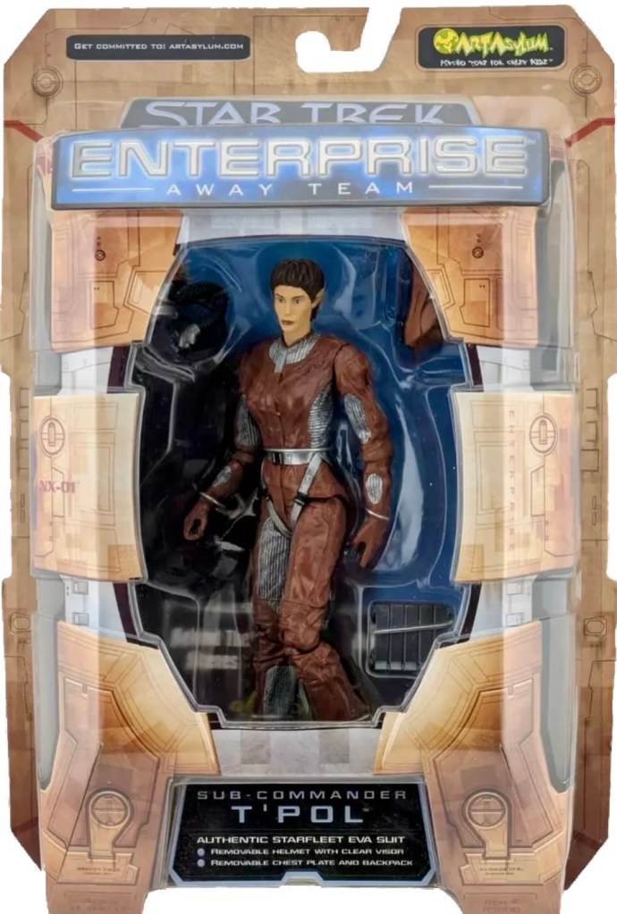 Notes: Sub-Commander T’Pol was the Science Officer aboard the Enterprise and portrayed by Jolene Blalock on the show. T’Pol has the distinction of being the very first Vulcan to serve aboard a human vessel. The figure is based on her appearance in the two-part series premiere “Broken Bow”. T’Pol comes with a phase-pistol, communicator, Vulcan scanner, an additional set of hands and an Enterprise display base.