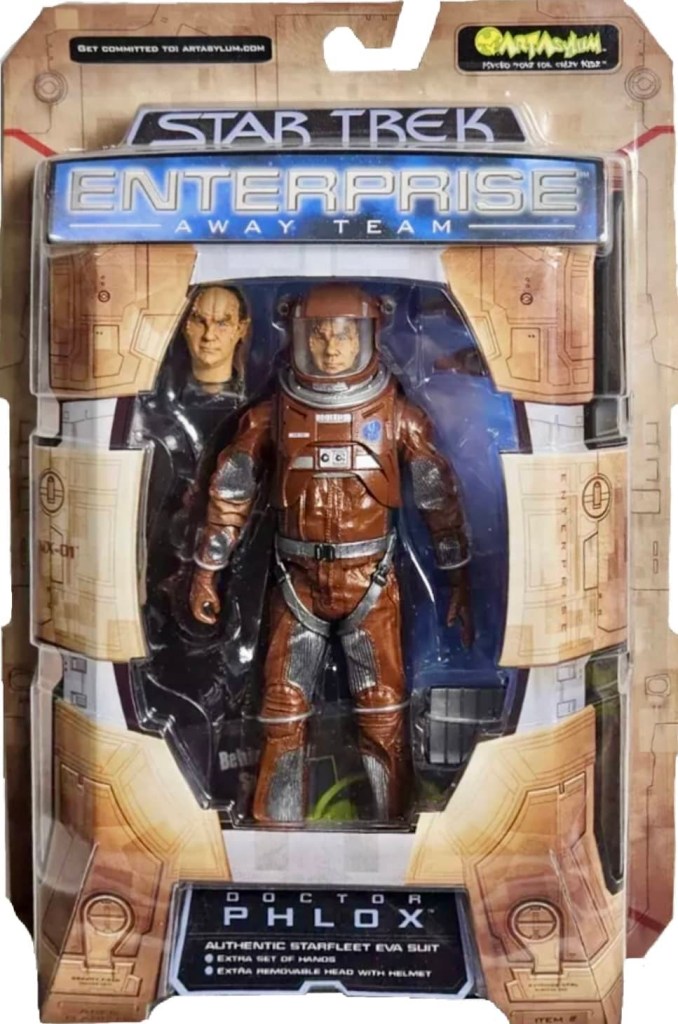 Notes: Doctor Phlox was the Chief Medical Officer aboard the Enterprise and portrayed by John Billingsley on the show. The figure comes with a removable chest plate, helmet and power cell, along with additional hands, head and a nifty Enterprise Coin.