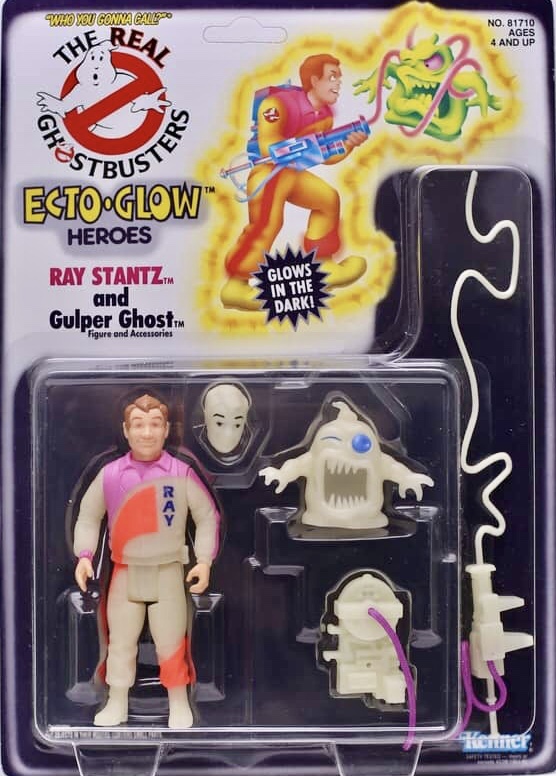 Notes: This is the newest version of Ray Stantz, as part of the ECTO-Glow Hero line. This time he glows in the dark, along with his proton pack, face mask, and Gulper Ghost.