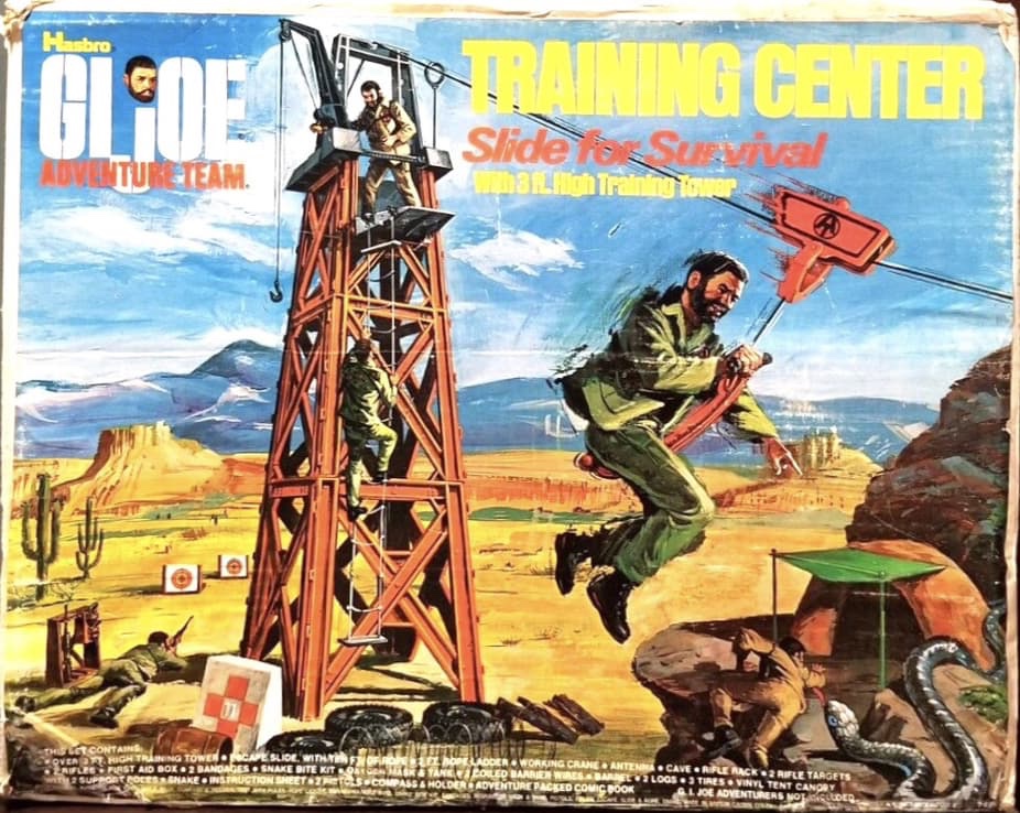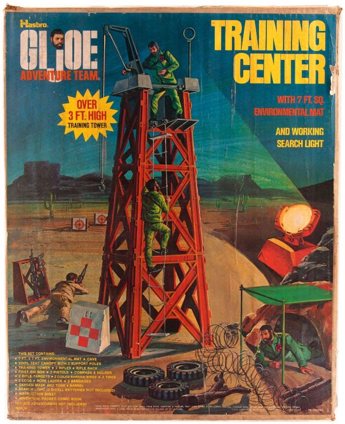 Notes: The Training Center playset was a new release for the Adventure Team series in 1973, but an exclusive Sears edition was released for the holidays that year. The Sears version still featured the three foot tower and lots of accessories, but removed the escape slide zip line and working crane from the tower. Instead, they included a MASSIVE 7×7 environmental play mat and a search light, similar to the one in the Headquarters set.