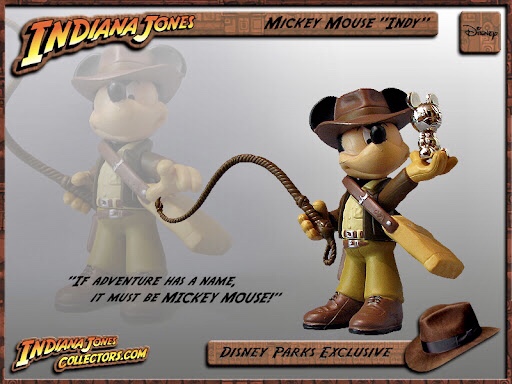 Disney’s exclusive Indiana Jones merchandise began in 2001, with one Indy figure, along with a 10″ vinyl figure. Five more figures were released in 2003 from the Epic Stunt Spectacular show. That same year saw the release of 12″ GI Joe themed figures, featuring Indiana Jones. Disney released one figure each in 2007 and 2011, with Indy from Raiders and Temple of Doom respectively. New Indy figures were released in 2008 featuring Mickey Mouse as the legendary explorer.