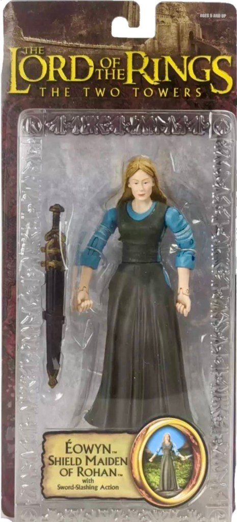 Toy Biz released only three waves of action figures for The Epic Trilogy Series, and only two Gift Sets. There were no new 12″ figures, Large Sized Figures, Horse Sets, Multipacks or other Accessories released for the line. The three new waves included many major characters from the movie, with a few brand new figures along with some that were previously released. Among the highlights were Council of Elrond Aragorn and Super Poseable Frodo from the Fellowship of the Ring wave; Gandalf Stormcrow and Eowyn Shield Maiden of Rohan from the Two Towers wave; and Gondorian Swordsman and Mordor Orc Lieutenant from the Return of the King wave. Toy Biz also released two nice looking Gift Packs, with Kings of Middle Earth and Elves of Middle Earth.