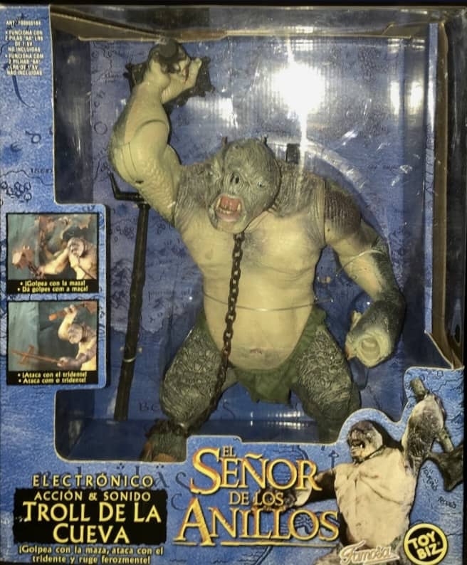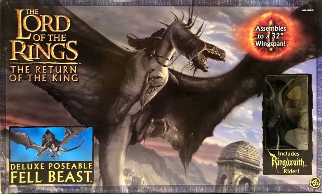 As in previous years, Toy Biz released several “Large Sized” figures, different than the traditional boxed 12″ figures. There were a few re-releases, including Treebeard, Sauron, Cave Troll and a two-pack featuring previously released Saruman and Sauron. Toy Biz did give us two new figures though, with the Electronic Battle Troll and a very cool looking Deluxe Poseable Fell Beast with a Ringwraith.