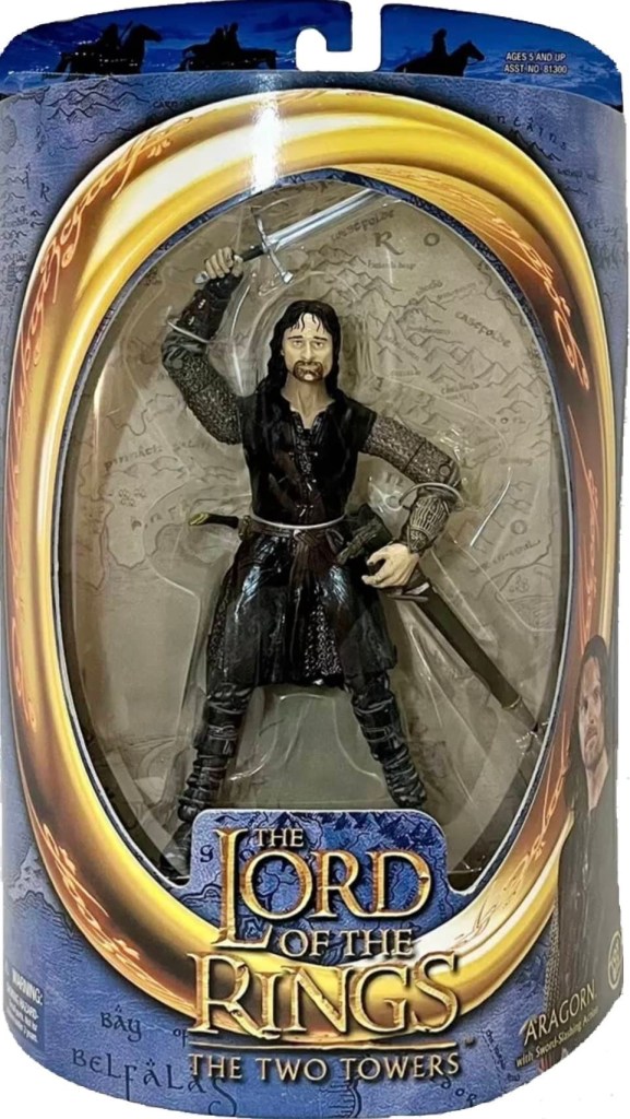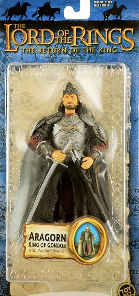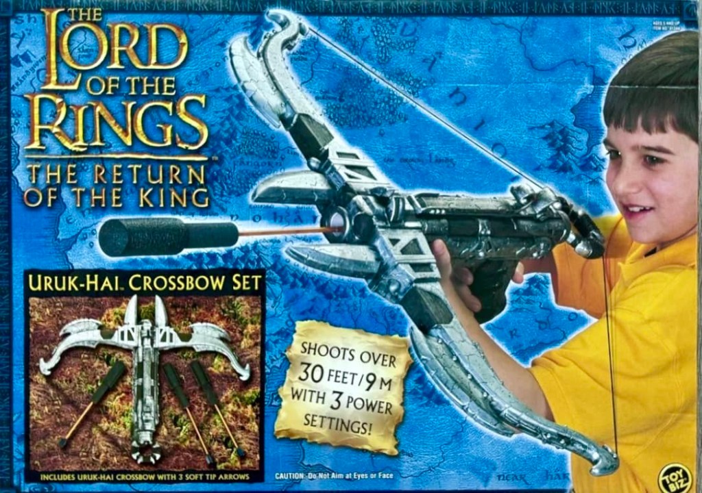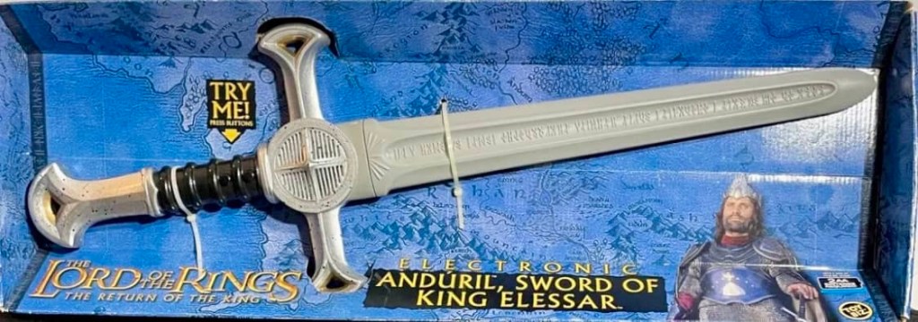 Toy Biz re-released the Electronic Light ‘N’ Sound Sting Sword and Uruk-Hai Crossbow Set for the Return of the King line, and even added a new roleplay weapon, the Electronic Anduril Sword of King Elessar, which was used by Aragorn.