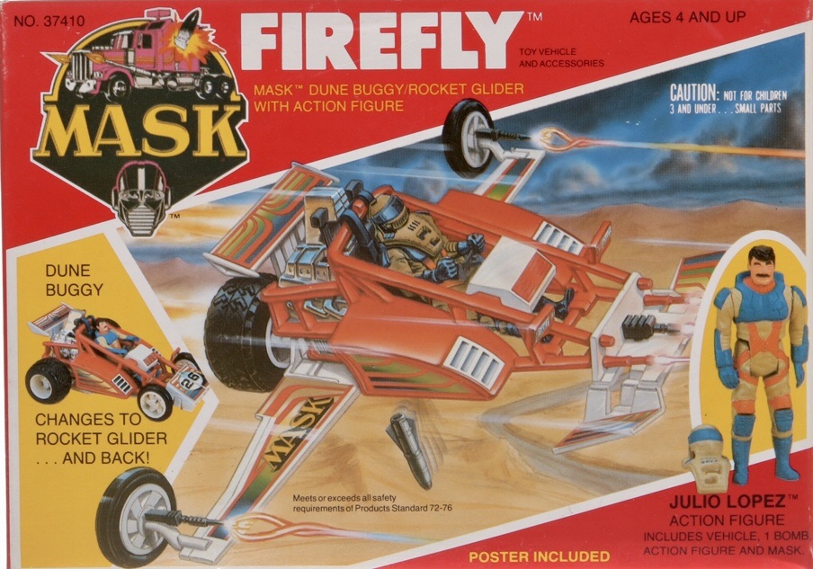 Notes: Firefly is a Dune Buggy that can change into a Rocket Glider. It’s operated by Julio Lopez, who goes by the codename, Doc. Lopez comes with his Streamer mask, which pretends to release super-tack glue. Firefly included a Tripod Laser, Supersonic Turbines, Prism Beam Launchers, Super Stun Atomizer and Snap Out Chassis Wings.