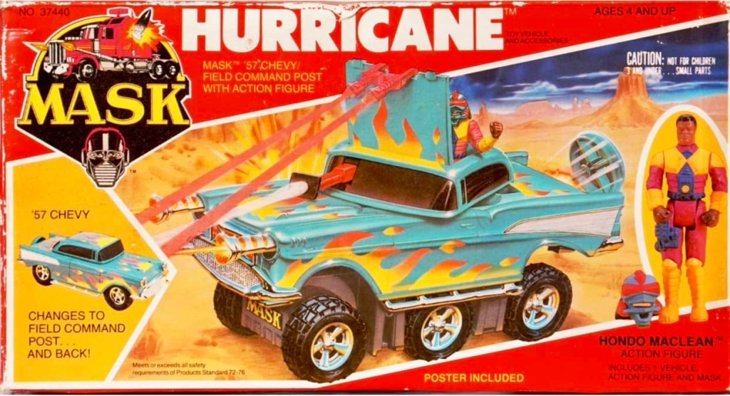 Notes: Hurricane is a 1957 Chevy that can change into a Field Command Post. It’s operated by Hondo MacLean, who goes by the codename, Striker. MacLean comes with his Blaster II mask, which pretends to shoot super sonic laser rays. Hurricane included Night Vision Scanner, Infrared Blasters, Gale Force Wind Howitzer, Mini Cutting Lasers, Terror Space Land Mine, Broad Sawblade and an Extra Set of Wheels.