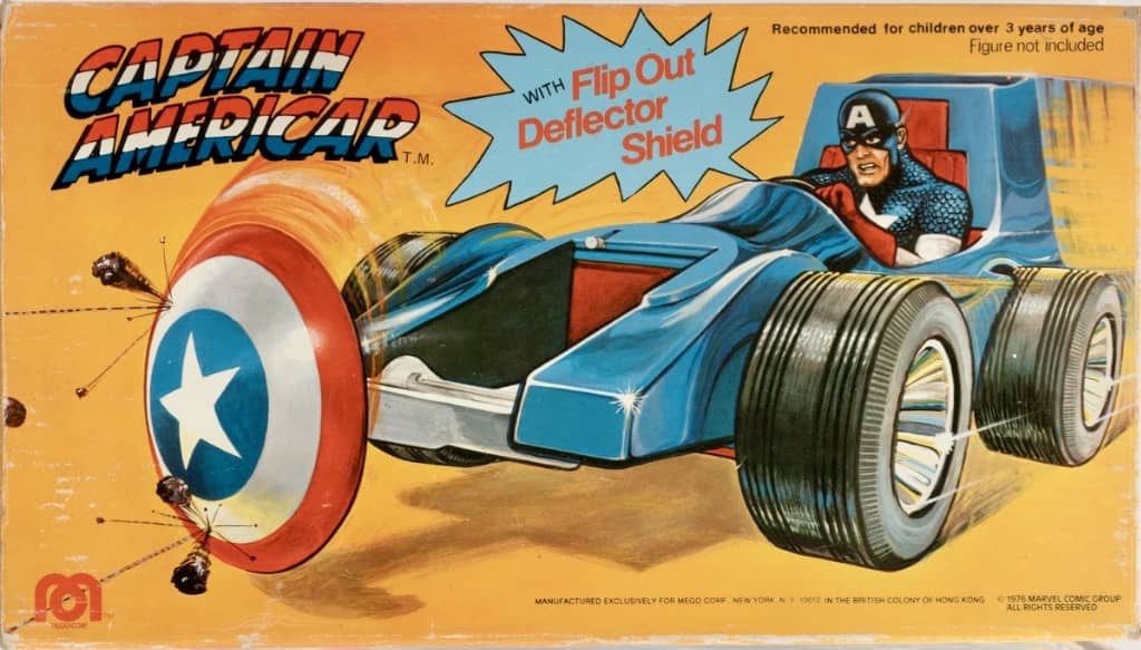Notes: The Americar was the official ride of Captain America, and this was a cool looking vehicle. It had the standard dune buggy look as the Green Arrowcar and Spider Car, but with the unique feature of Cap’s shield on the front of it. The shield would actually moves forward and “bash” the bad guys when it was activated. This vehicle is one of the more rare ones from Mego and can be very difficult to track down.