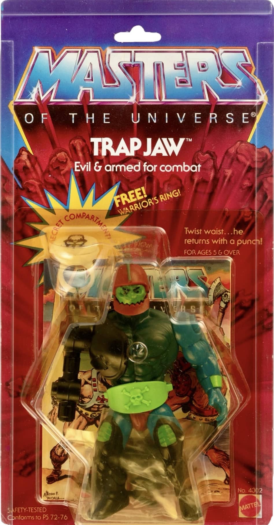 Notes: Trap Jaw is one of Skeletor’s main thugs used to battle He-Man and friends. Trap Jaw had thee different arm variations that could be changed out, Hook Arm, Rifle Arm, and Claw Arm. Along with his opening and closing “Iron Jaw”, Trap Jaw also had a special feature that allowed you to twist his waist and watch him throw a Power Punch. In addition, he came with a removable green belt, mini-comic and a super cool glow in the dark Warrior Ring with a secret compartment!