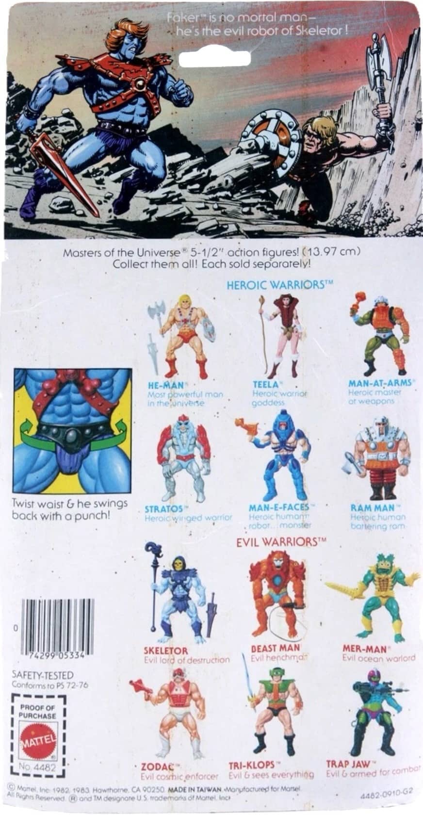 Notes: Faker is a devious creation of Skeletor, built to be a robotic duplicate of He-Man. Like the other figures, Faker had a special feature that allowed you to twist his waist and watch him throw a Power Punch. He comes with his removable armor and sword. Two different versions of Faker’s head sculpt exists with one being made of hard plastic and the other being soft plastic. Faker was among the first wave two figures to be released and was available on a “8-Back” card, as well as the standard wave two “12-Back” card.
