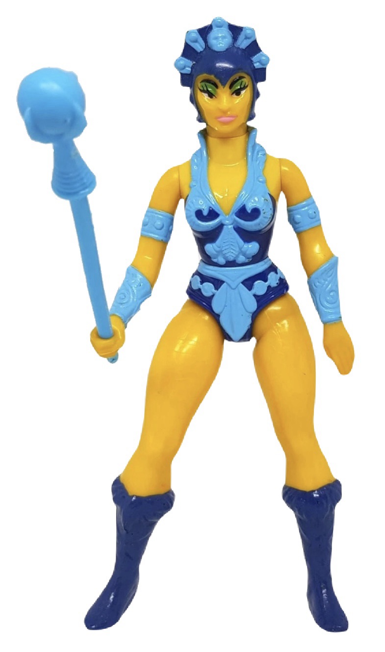 Notes: Evil-Lyn is one of the most powerful and intelligent villains in the Masters of the Universe universe. Serving as Skeletor’s second-in-command, she is a dark sorceress who wields formidable magic and often schemes for her own gain. Evil-Lyn had a special feature that allowed you to twist her waist and watch her throw a Power Punch. Evil-Lyn comes with her staff, removable armor and a mini-comic. Fun Fact: Mattel reused the mold of the Teela figure for Evil-Lyn with a new yellow skin tone.