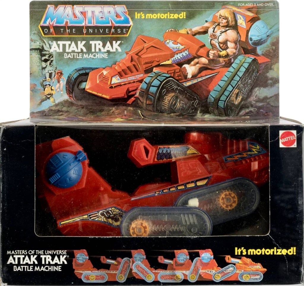 Notes: The Attack Trak is a rugged, all-terrain vehicle used by He-Man and the Heroic Warriors to travel swiftly across the wild landscapes of Eternia. The Attack Trak was battery-powered and had a neat feature that allowed it to bump into objects and then flip around to go in another direction. It ran on “C” batteries, which did not come with the vehicle.