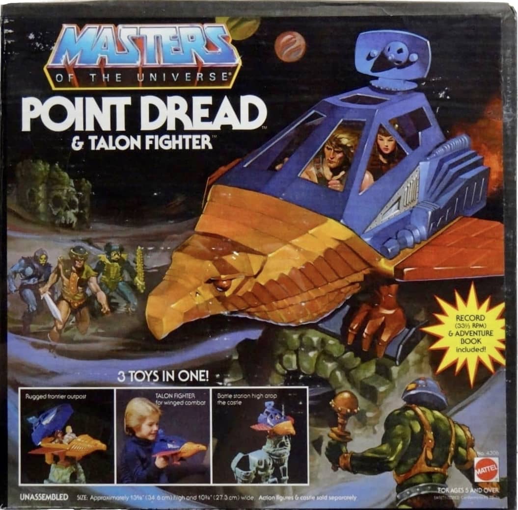 Notes: The Point Dread and Talon Fighter was a bit of a vehicle and playset combo, to be used in conjunction with the Castle Grayskull Playset. The tower base would fit onto the tallest turret of the Castle Grayskull playset, and act as a perch for the Talon Fighter vehicle to land. The Talon Fighter vehicle itself was able to fit two figures inside (not included). The set also comes with a 33 rpm record to listen to, along with an accompanying adventure book.