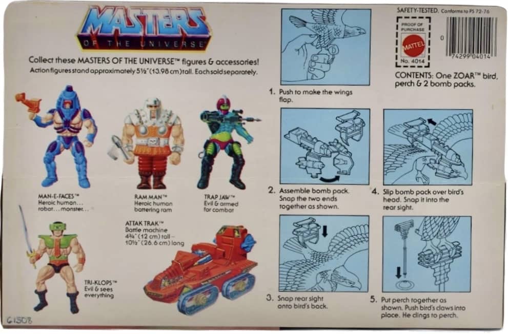 Notes: According to the mini-comics, Zoar “The Fighting Falcon” was originally an ally to He-Man that would assist him in battle. The narrative changed with the animated series, as it depicted Zoar as a mystical falcon attached to the Sorceress. Zoar’s wings could actually flap up and down by pushing the trigger button. Zoar also comes with Battle Armor, Falcon Stand, and a Bomb Pack.