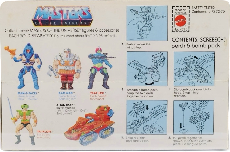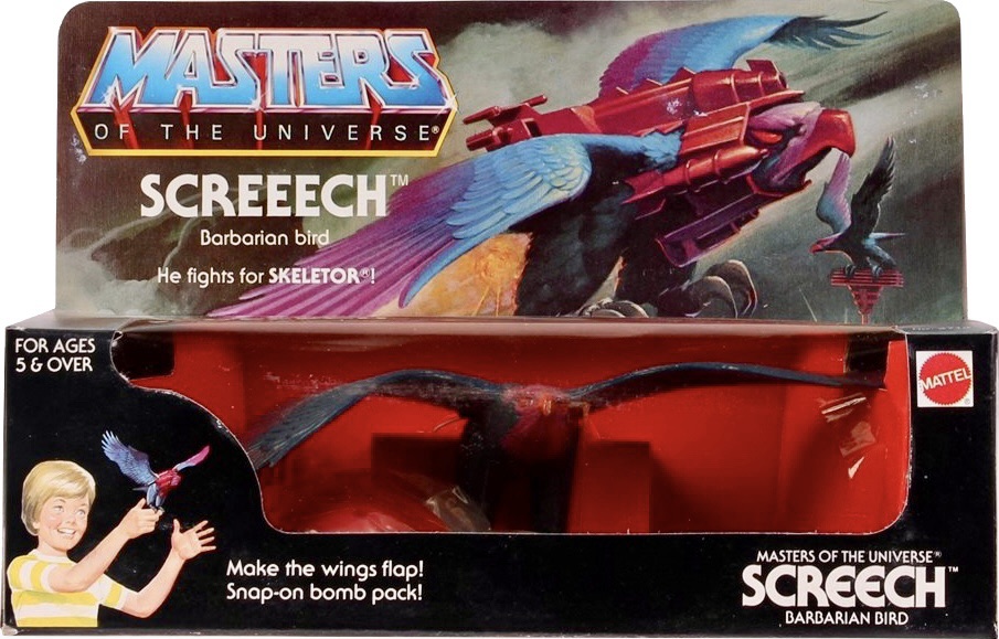 Notes: Screeech (not to be confused with Screech from Saved by the Bell) “The Barbarian Bird” was the evil version of Zoar and was used by Skeletor to swoop into battle against the Heroic Warriors. Screeech’s wings could actually flap up and down by pushing the trigger button. Screeech comes with his own Battle Armor, Perch, and Bomb Pack.