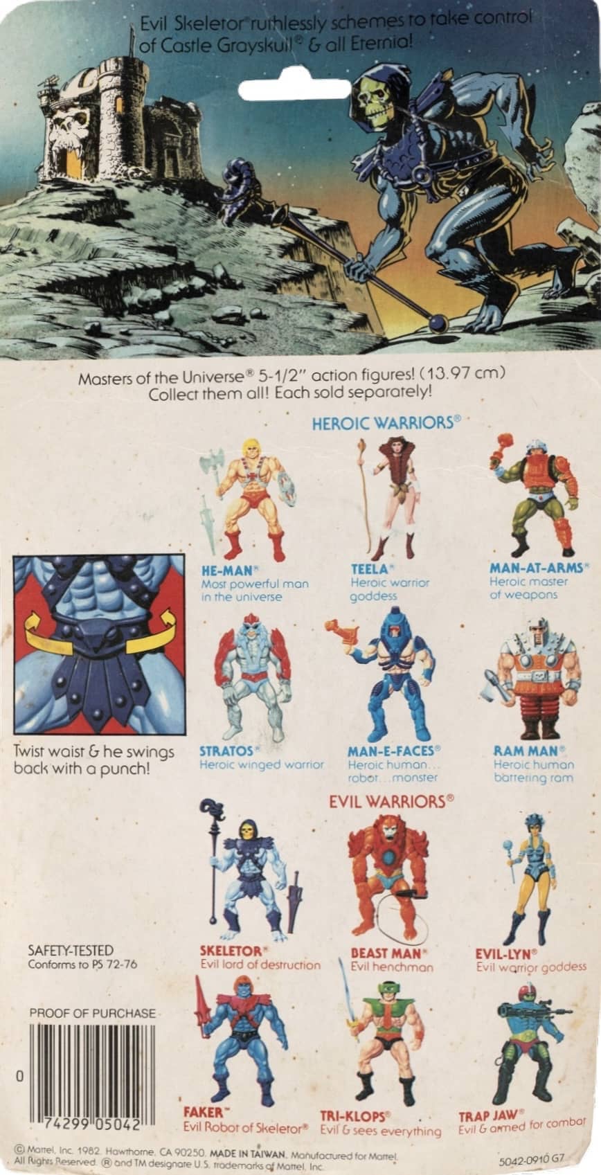 Notes: The “Original” Skeletor was basically a re-issued version, almost identical to the original released in 1982. The word “original” was added to the card to avoid confusion with the new Battle Armor version of Skeletor, also issued in this wave. Skeletor still had a special feature that allowed you to twist his waist and watch him throw a Power Punch.