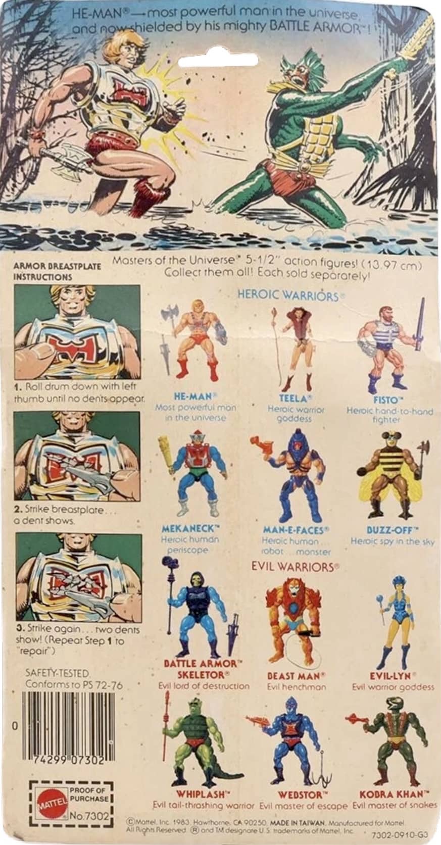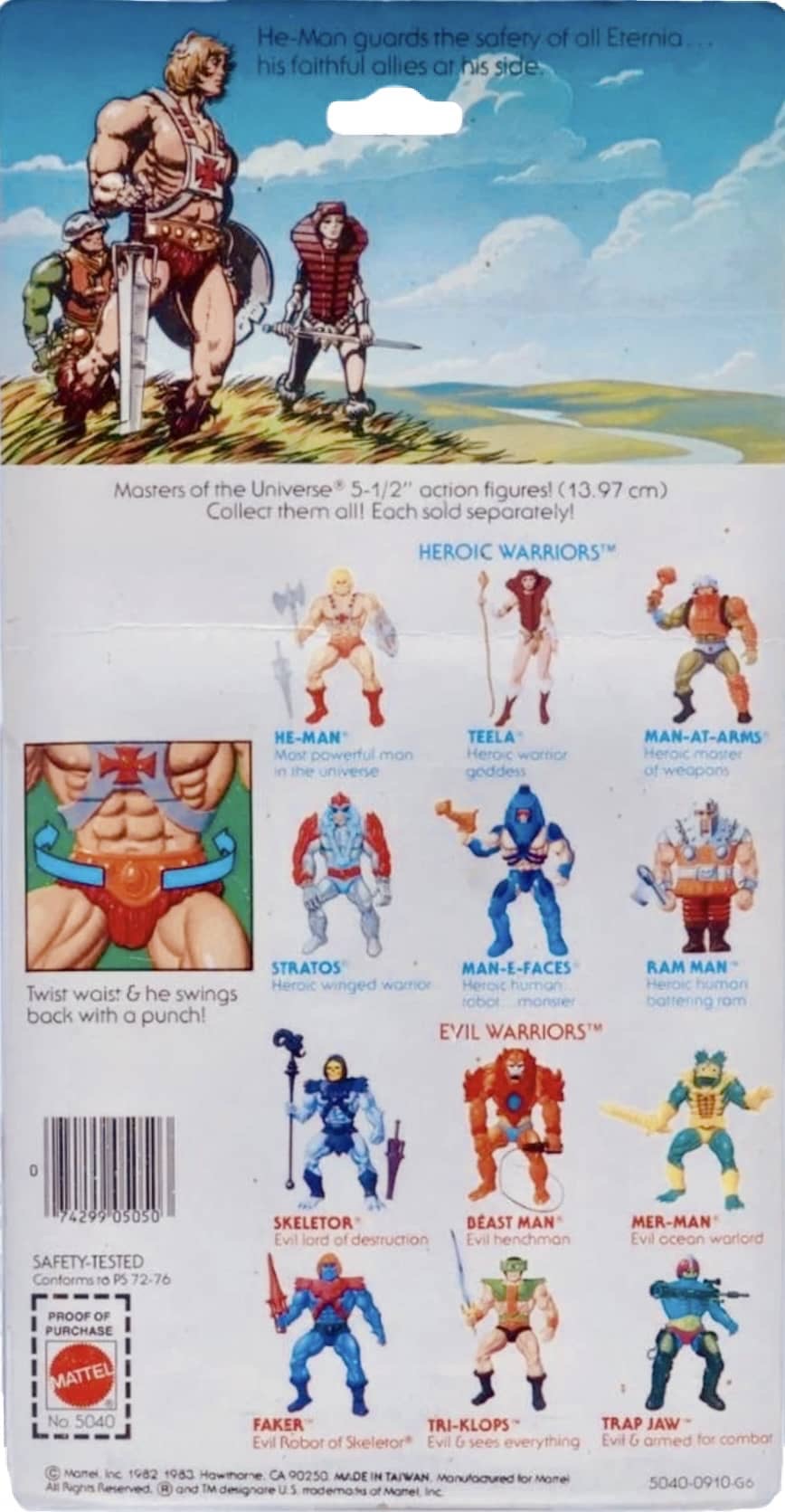 Notes: The “Original” He-Man was basically a re-issued version, almost identical to the original released in 1982. The word “original” was added to the card to avoid confusion with the new Battle Armor version of He-Man, also issued in this wave. He-Man still had a special feature that allowed you to twist his waist and watch him throw a Power Punch.