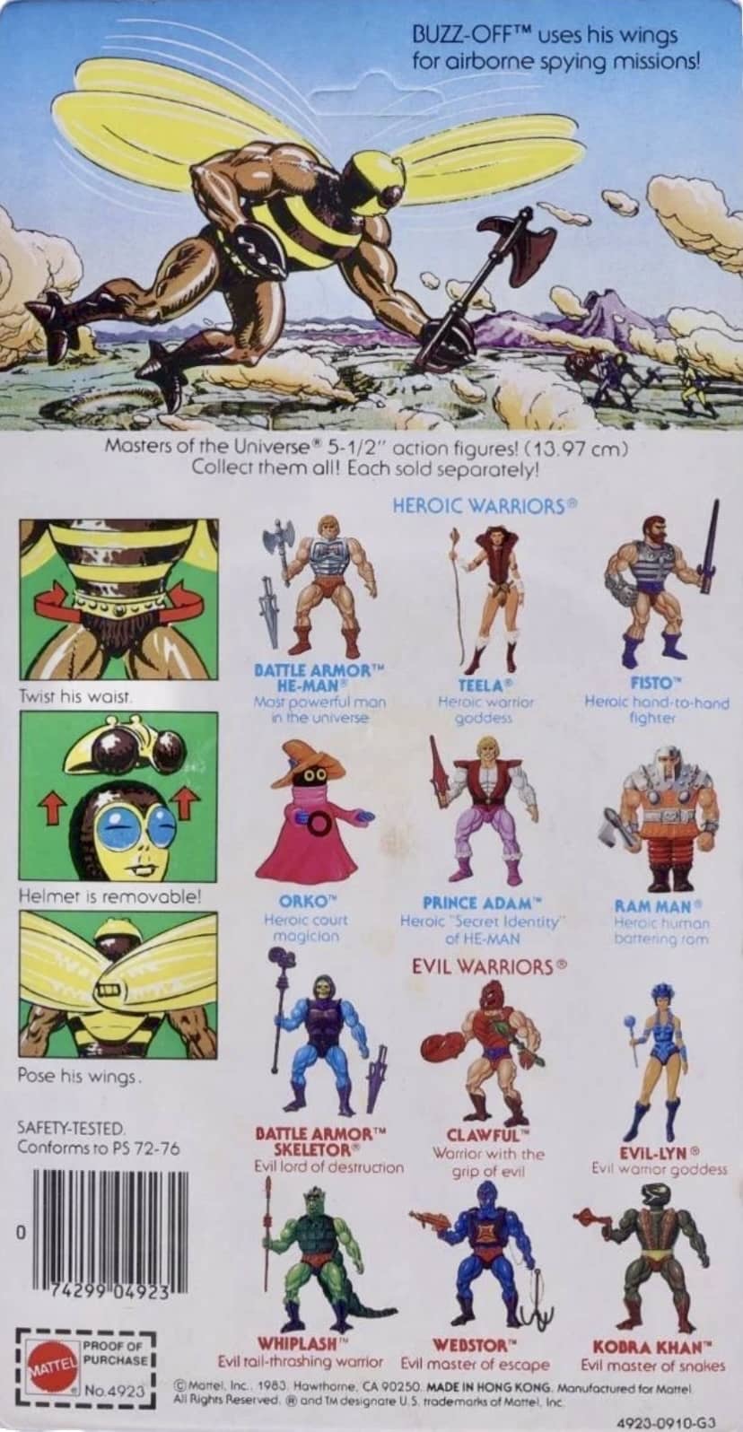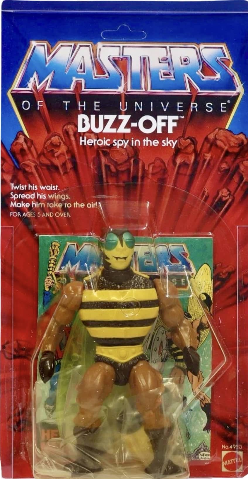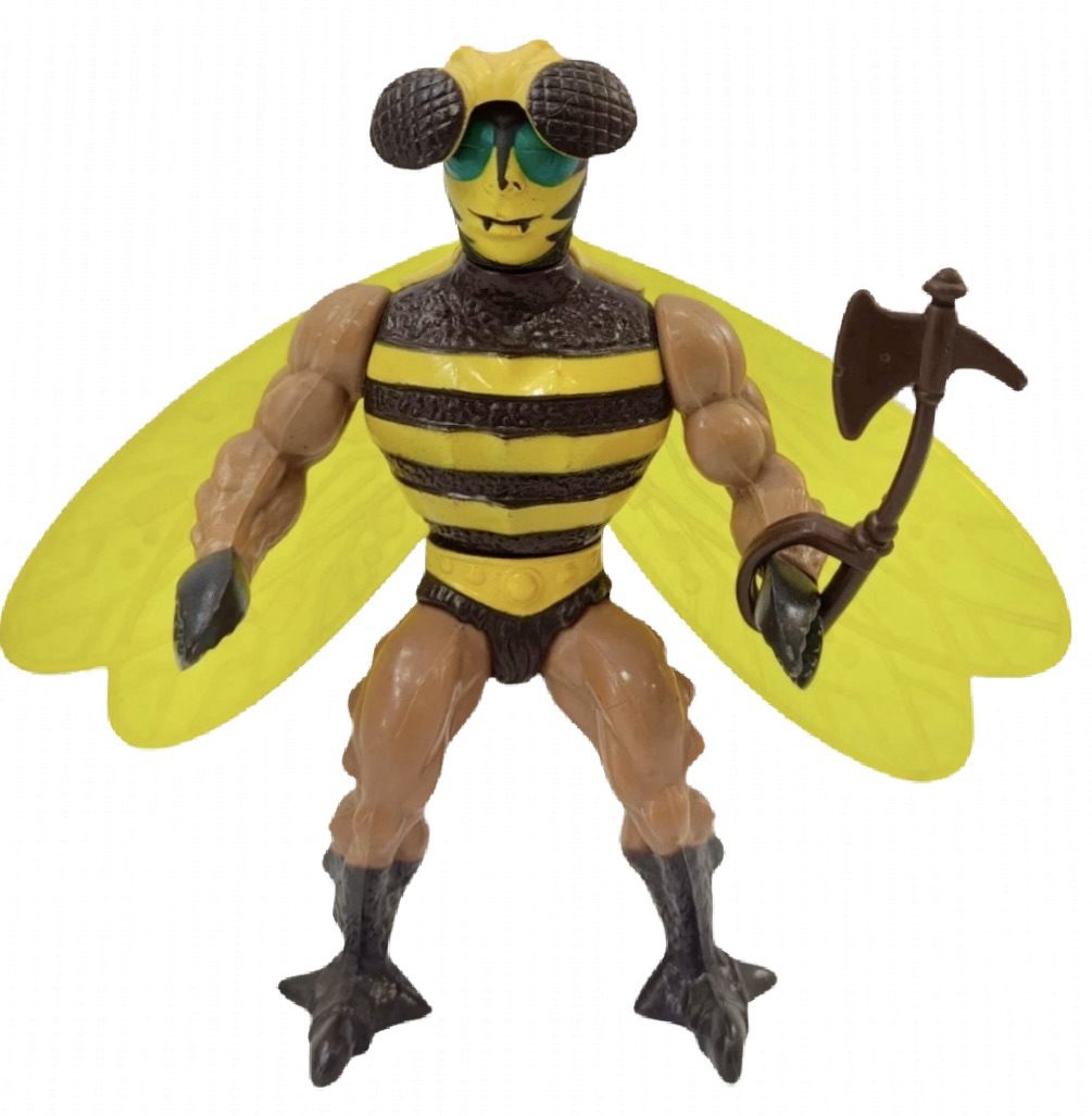 Notes: Buzz-Off is a heroic warrior from the bee-like race known as the Andreenids, who inhabit the mystical city of Andreenos. As the “Heroic Spy in the Sky,” Buzz-Off serves as a loyal ally to He-Man and the Masters. He has an action feature that allows you to twist his waist to throw a power punch. He also comes with his removable helmet, axe, mini-comic and beautifully crafted transparent yellow wings.