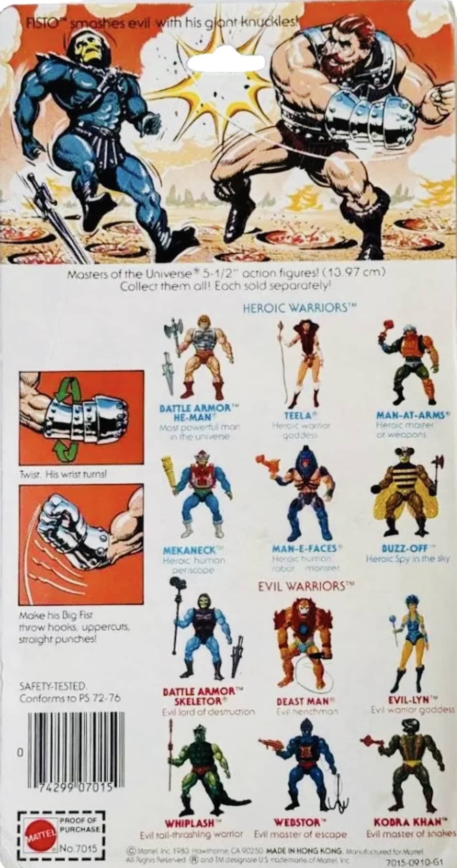 Notes: Fisto is one of the strongest heroic warriors in the Masters of the Universe universe. Known for his massive metal fist and gruff demeanor, Fisto once lived as a rogue in the wilderness but eventually joined forces with He-Man and the Masters to fight evil. Fisto has a special feature that allowed you to twist his waist and watch him throw a Power Punch with his spring loaded fist.