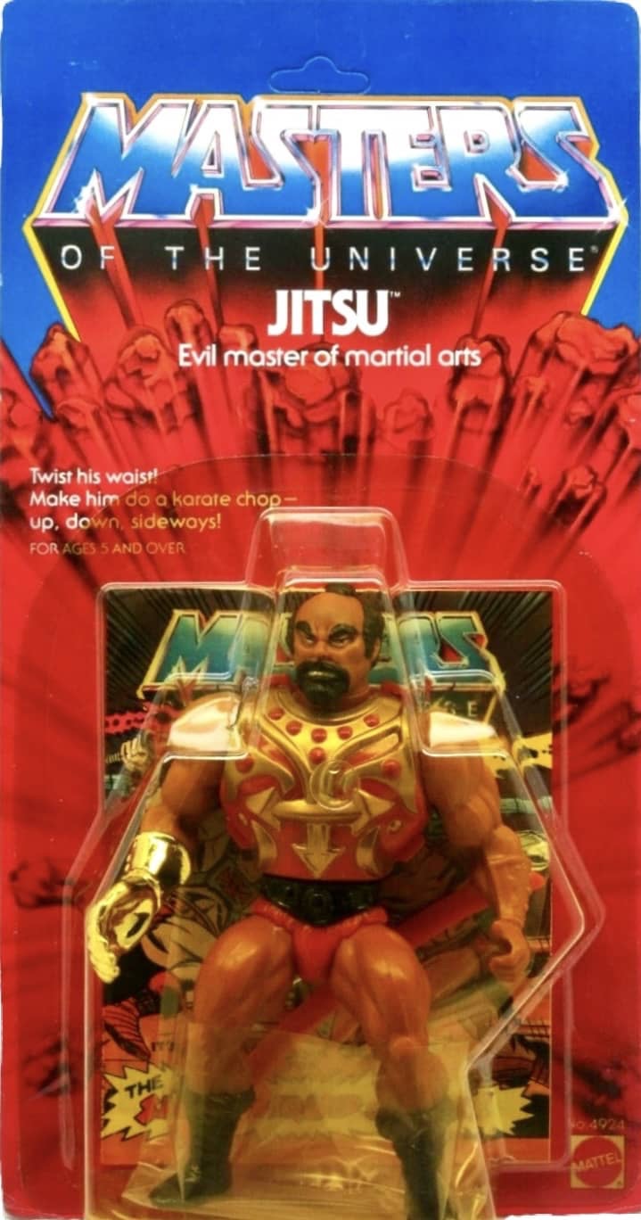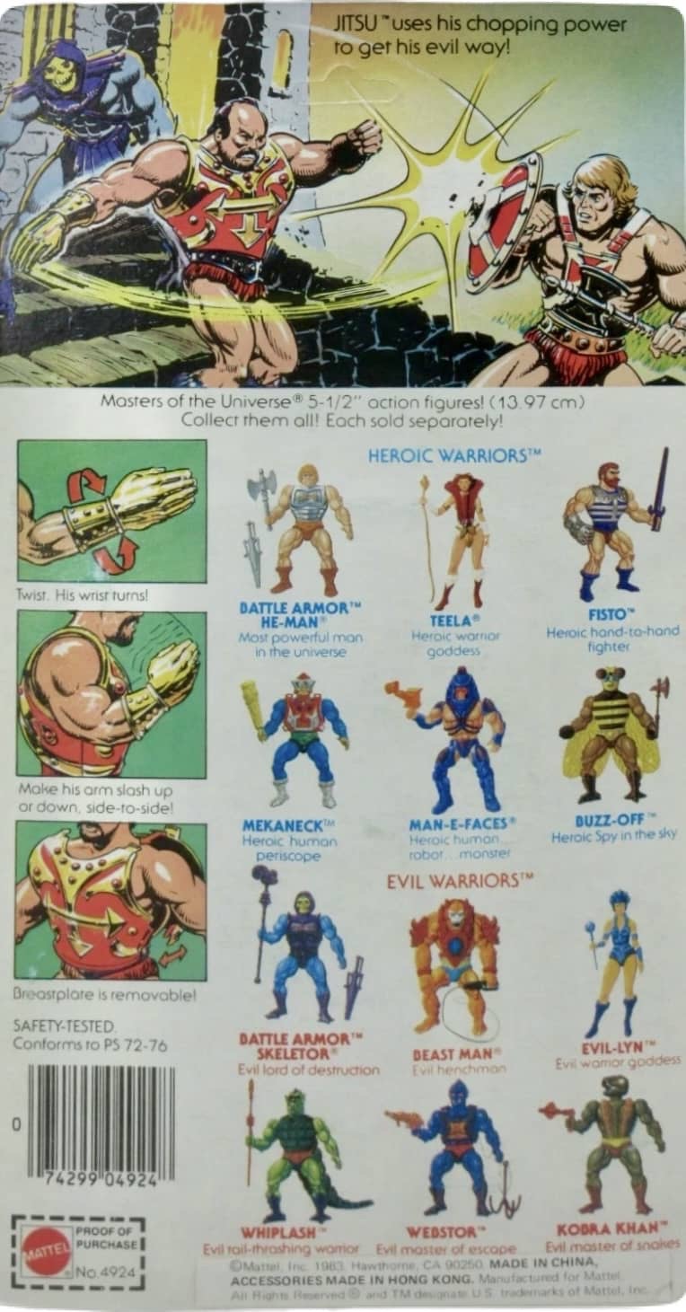 Notes: Jitsu is Skeletor’s deadly martial arts expert, known for his lightning-fast strikes and powerful golden chopping hand. A fierce warrior with unmatched combat skills, Jitsu is often sent on missions that require stealth, precision, and brutal force. Jitsu has a special feature that allowed you to twist his waist and watch him use his spring loaded karate chop move. He also carries a samurai sword and removable chest armor.