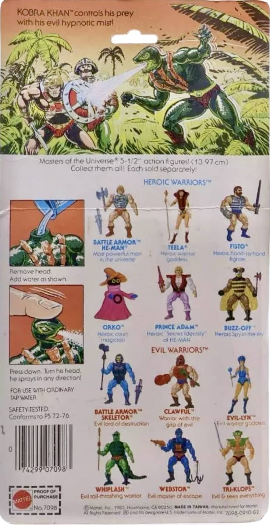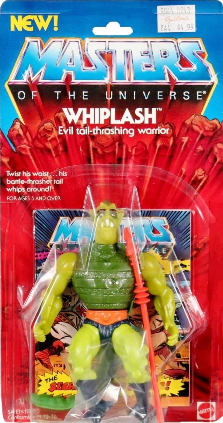 Notes: Whiplash is a fierce and relentless member of the Snake Men, an ancient serpent-like society. Known for his powerful reptilian tail, which he wields like a deadly whip, Whiplash can deliver crushing blows and incapacitate his enemies from a distance. Whiplash’s standout feature was his spring-loaded snapping tail by pressing a button on his back. He also comes with an orange spear for battle.
