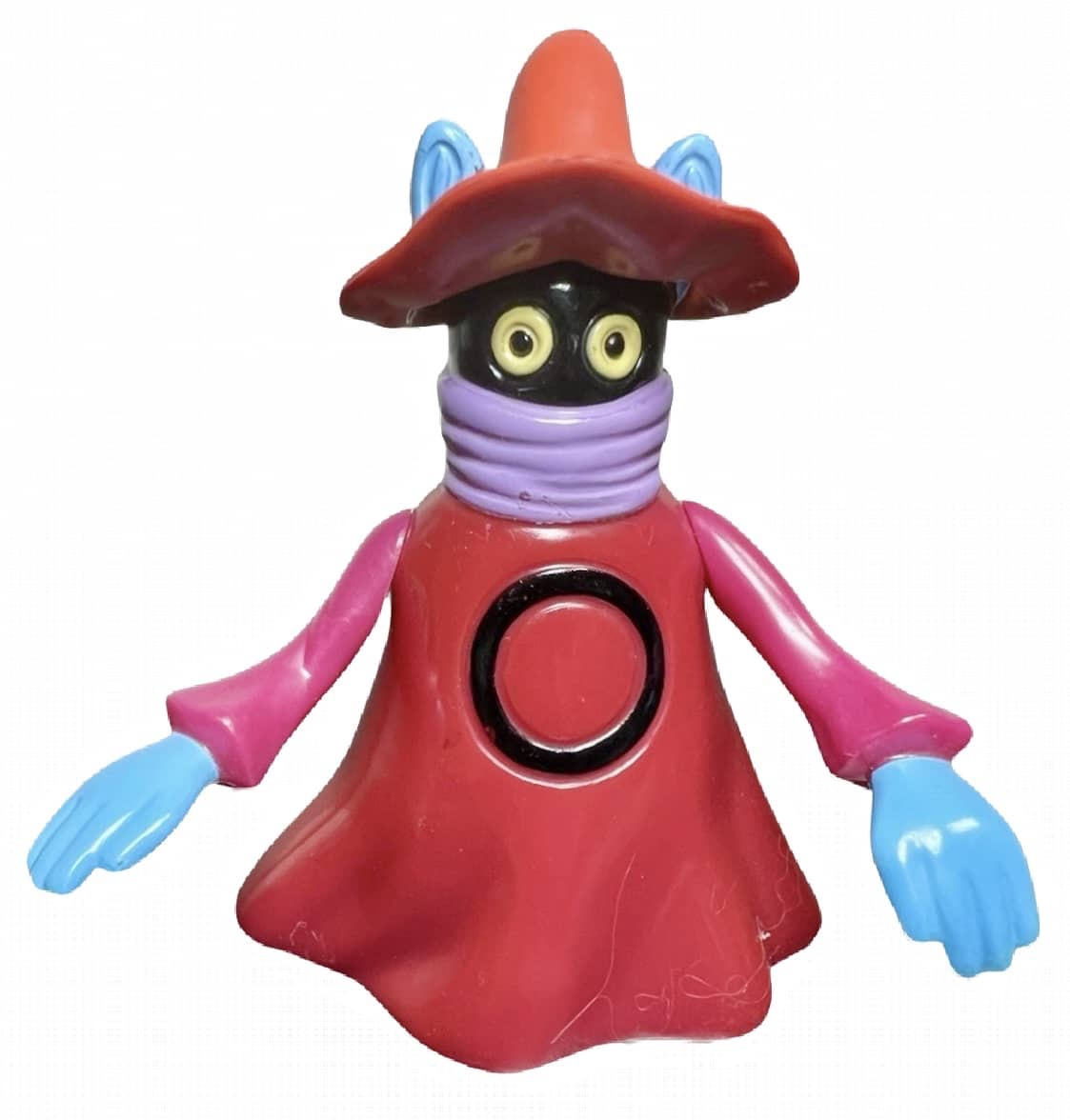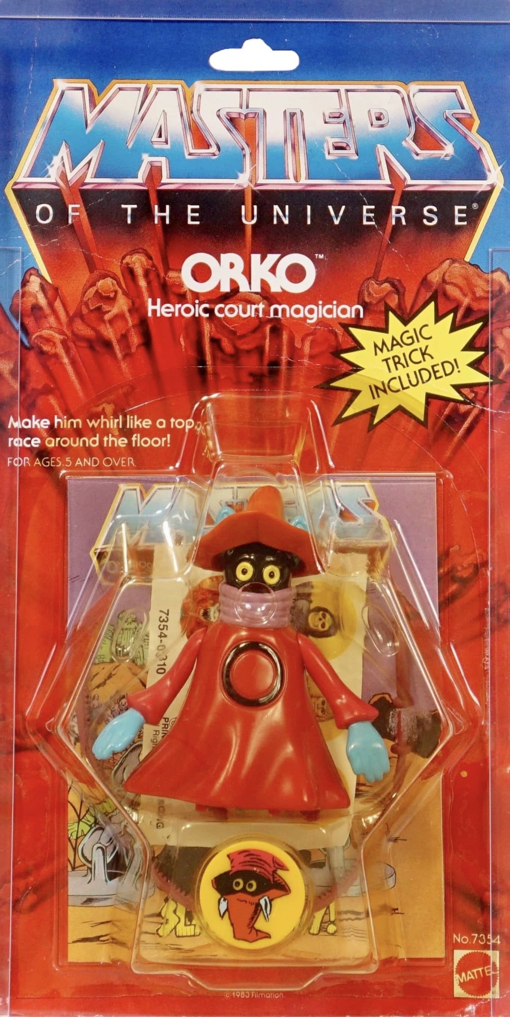 Notes: Orko is the lovable (and often clumsy) court magician of Eternia and a close companion of Prince Adam and He-Man. Orko floats around the royal palace attempting spells—most of which go hilariously wrong. Despite his bumbling nature, Orko is brave, loyal, and has powerful magic when it truly counts. Orko’s special feature was that when you inserted the ripcord and pulled it out quickly, Orko would make use of his small wheels and just take off.