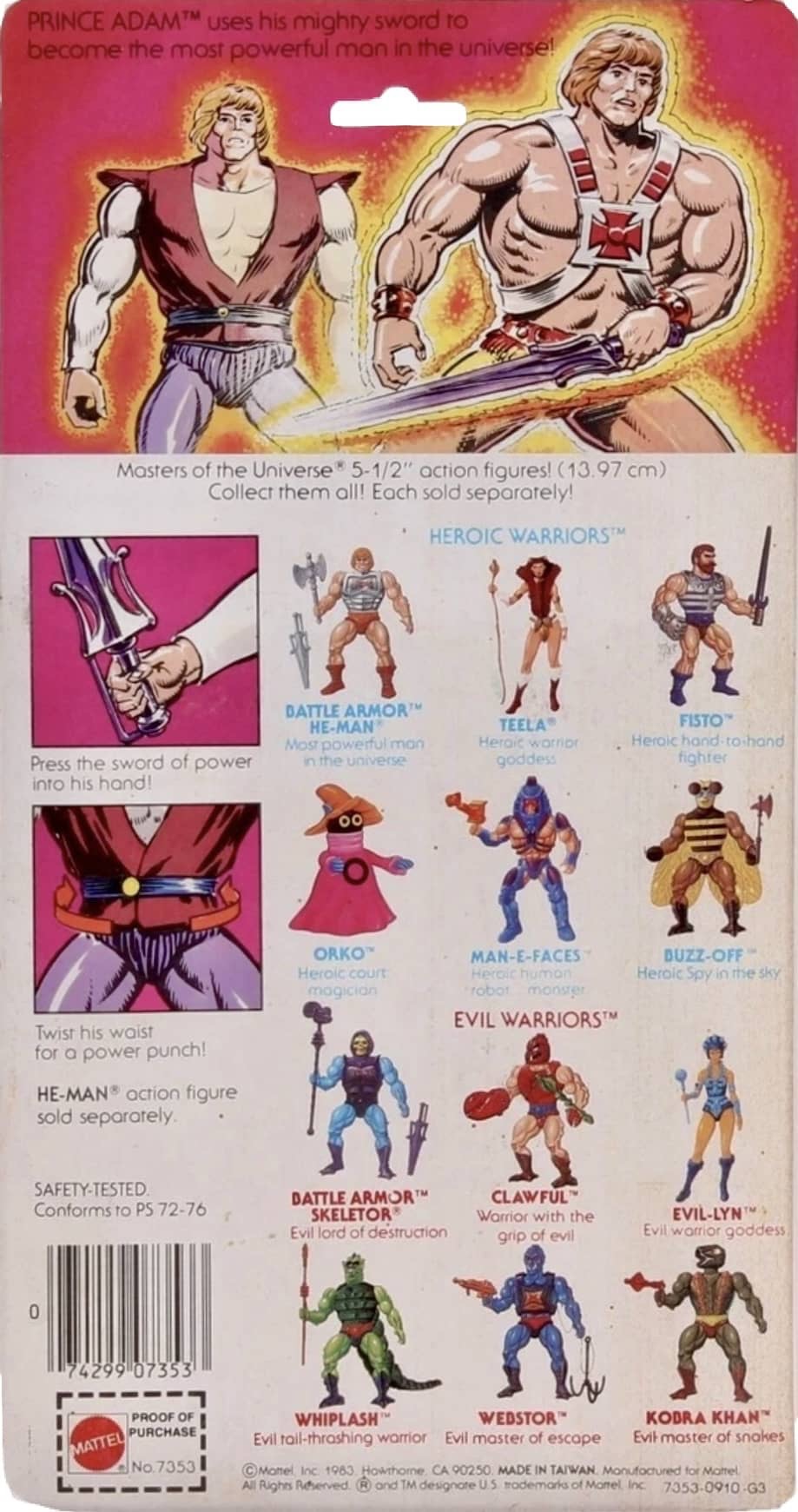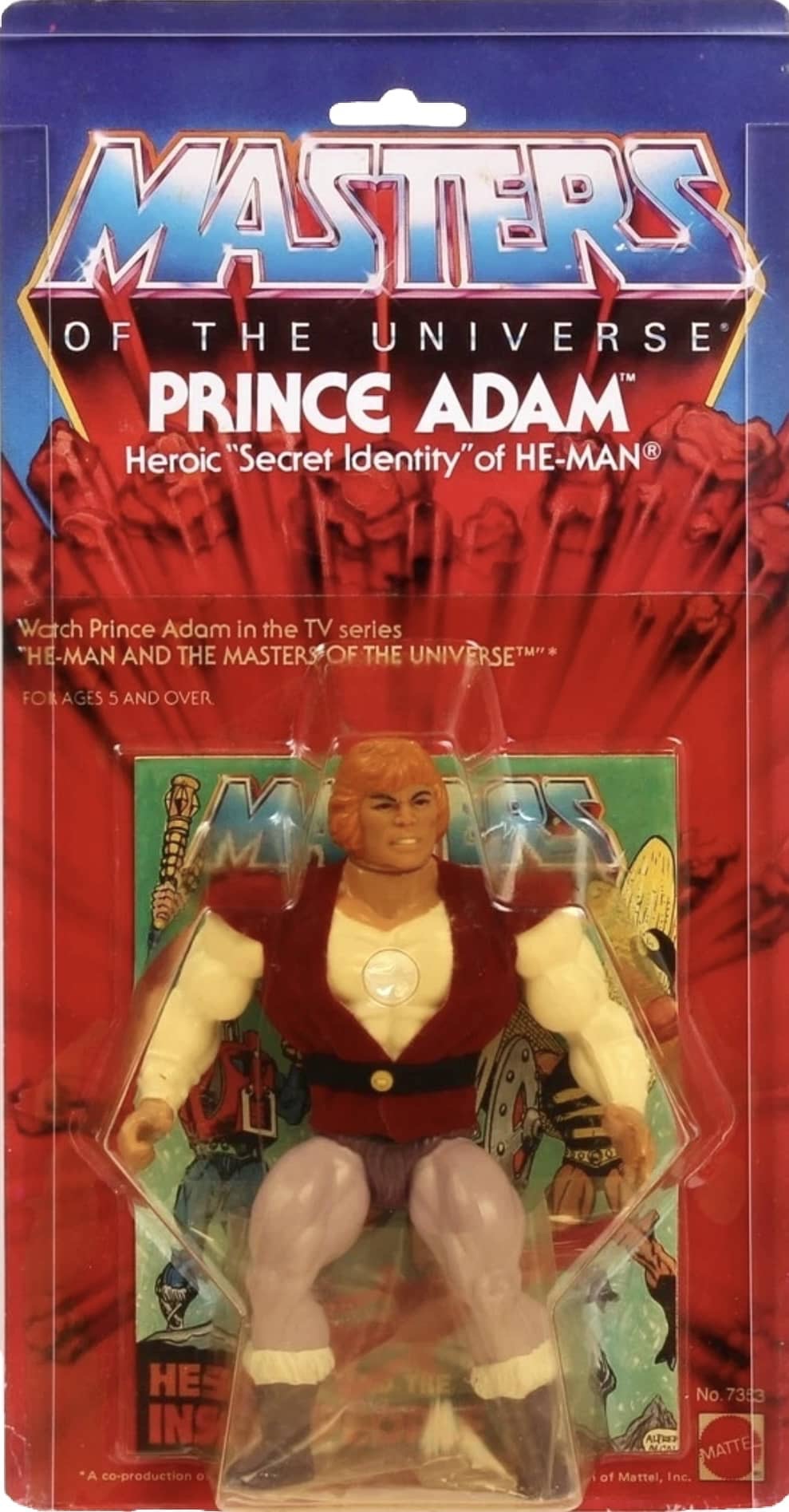 Notes: Prince Adam is the mild-mannered alter ego of He-Man, the most powerful man in the universe. As the son of King Randor and Queen Marlena, Adam plays the role of a carefree and somewhat lazy royal, but in reality, he carries the great responsibility of protecting Eternia. His secret is known only to a select few, including Orko, the Sorceress, Man-At-Arms, and Cringer/Battle Cat. Prince Adam comes with the standard power punch feature when you twist his waist. He also has his power sword, belt and vest.