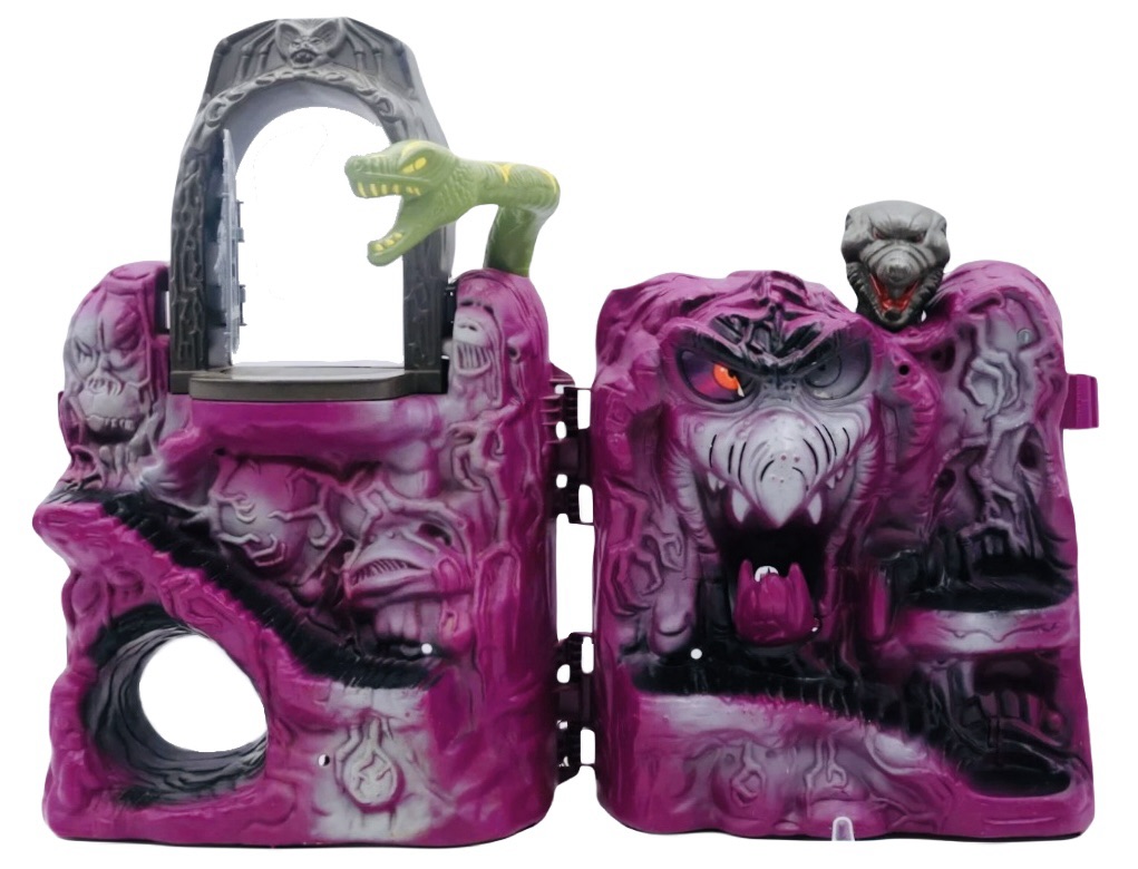 Notes: Snake Mountain is the menacing headquarters of Skeletor and his evil forces. This dark fortress features a sprawling design with multiple levels, secret passages, a trap door, and a working drawbridge, creating endless opportunities for villainous schemes. The playset includes a throne room for Skeletor, a skeletal elevator, and various platforms for battle. Accessories like weapons racks, a weapons accessory pack, and themed furniture enhance the immersive play experience, making Snake Mountain the ultimate base for the forces of evil in Eternia. The neatest thing about Snake Mountain was the snake head microphone that you could talk into and it would disguise your voice as “frightening and evil”.