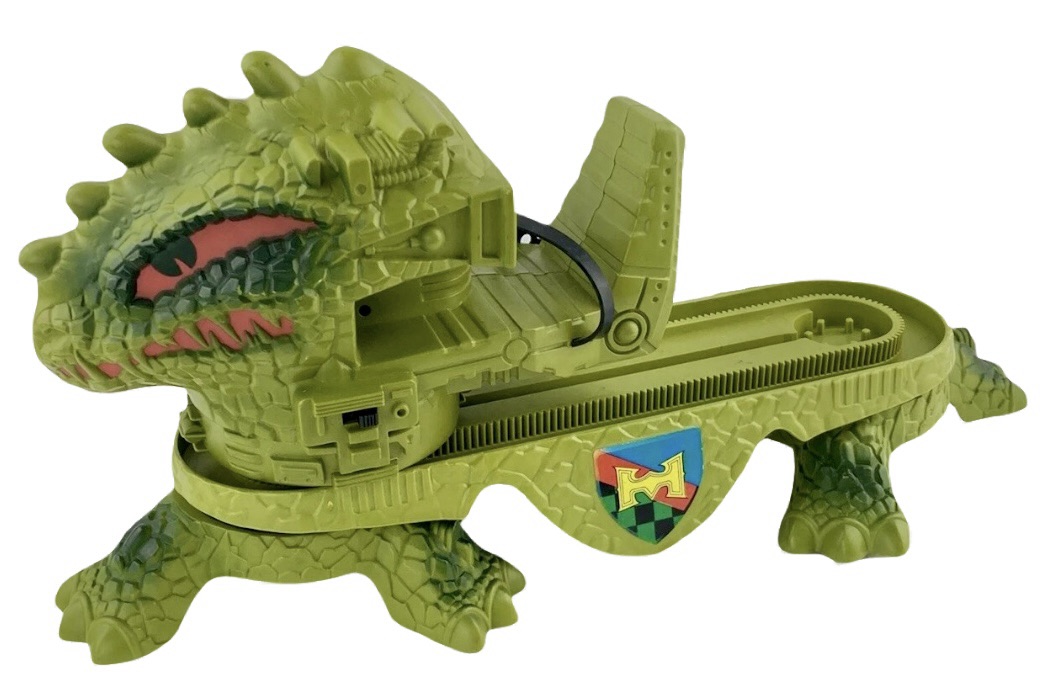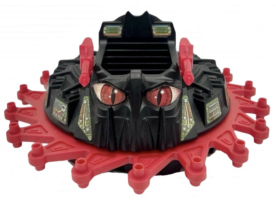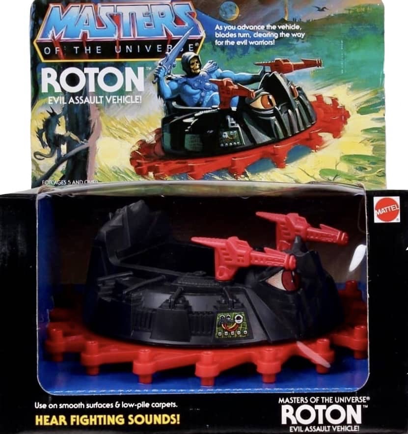 Notes: Roton is a fearsome, circular tank-like vehicle used by Skeletor’s forces. It features a spinning blade rotor in the front and spring-loaded missiles for attacking enemies. With a cockpit for a figure to pilot, Roton is designed for fast, aggressive assaults. The Roton’s all-around saw blade spins around when the vehicle is pushed forward or backwards.