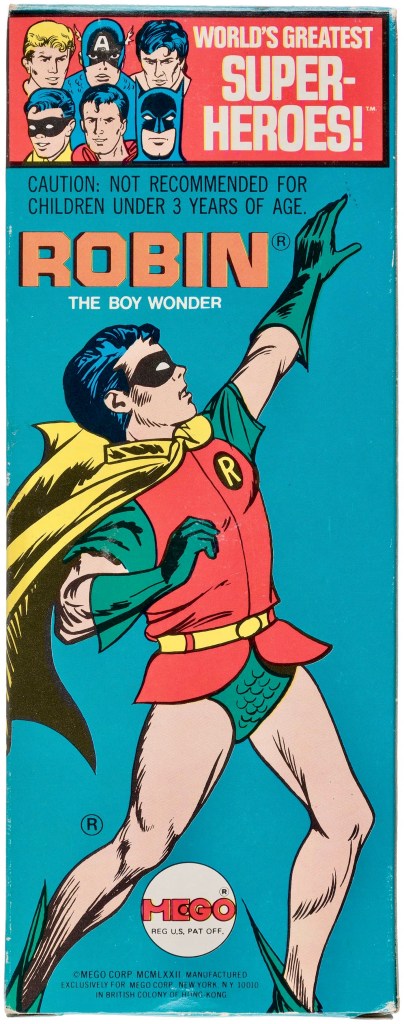 Notes: The solid box packaging version of Robin was one of Four original releases in 1972 of the WHSH line. It was only available in select markets and retailers. Mego changed their box packaging beginning in 1973, to a more friendly window version, so buyers could actually see the figure inside. There were no variations from the solid box to the initial open box versions in 1973. Robin came with his cloth tunic and emblem on it, along with his removable mask, shorts, belt, cape, shoes and gloves.