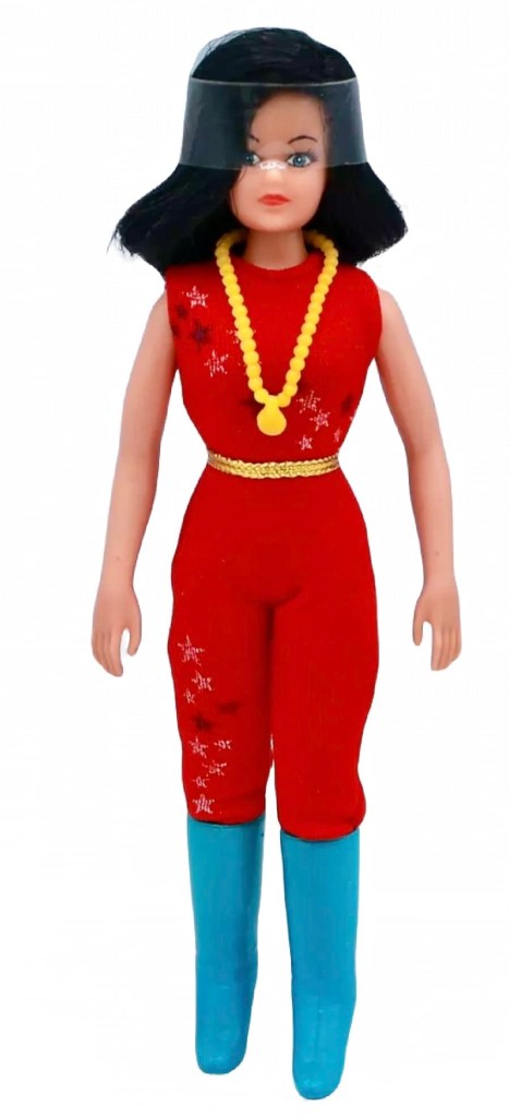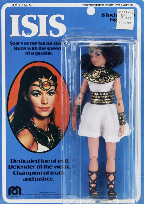 Notes: Isis was released in 1976 with the open box format used at the time. It should be noted that Isis’ box has a different design than others in the series. She switched over to the carded blister pack format until 1978, when she was eventually removed from the WSGH lineup. Isis is included with the DC characters, due to her DC comic book published during this time period. Isis came with her cloth outfit, undergarments, sandals and bracelets. Note that the headpiece for Isis is not removable and molded onto her head.