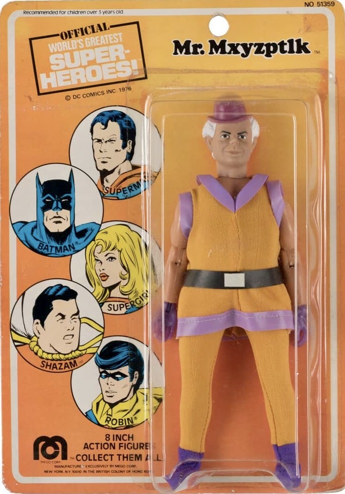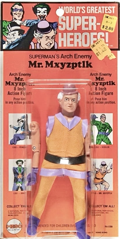 Notes: Mr. Mxyzptlk made his Mego debut in 1974 with the open boxed version. Mego later switched their packaging format to a carded blister pack from 1976 until 1978, when he was eventually removed from the WSGH lineup. There were no variations from the Boxed to Carded versions. Mr. Mxyzptlk came with his cloth outfit and belt. Interesting that Mxyzptlk was made, but no Lex Luthor.